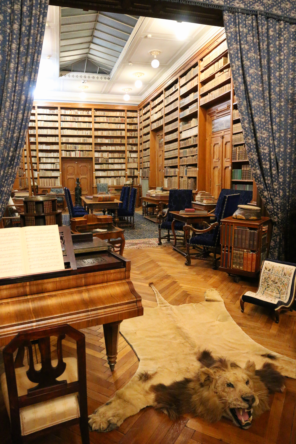 knjižnica s 15 tisoč knjig, umetniška dela, lovske trofeje, celo 2 mumije iz